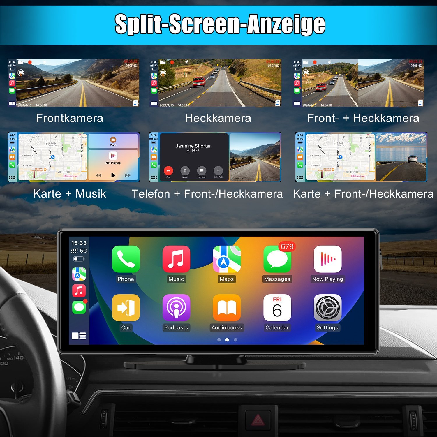 Écran **CarPlay** portable avec écran tactile HD **10,26 pouces**, **Apple CarPlay & Android Auto sans fil**, **Bluetooth 5.0** et **caméra de recul AHD**. Montage simple Plug & Play.